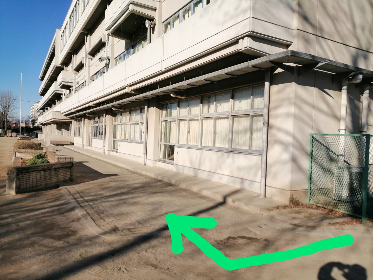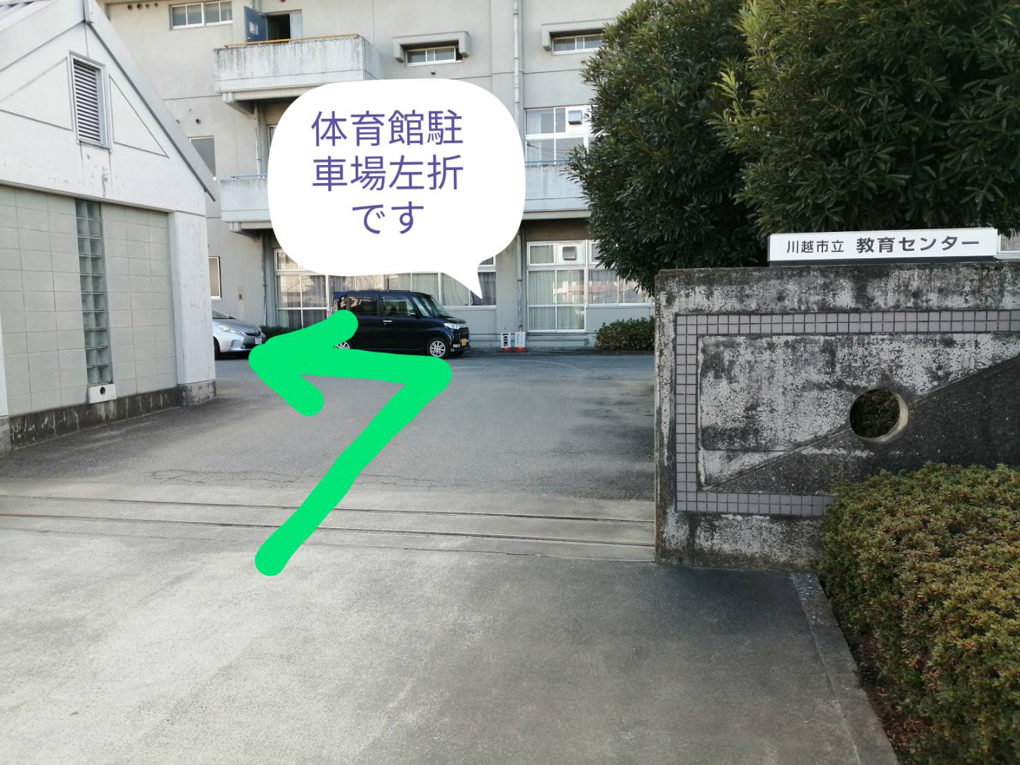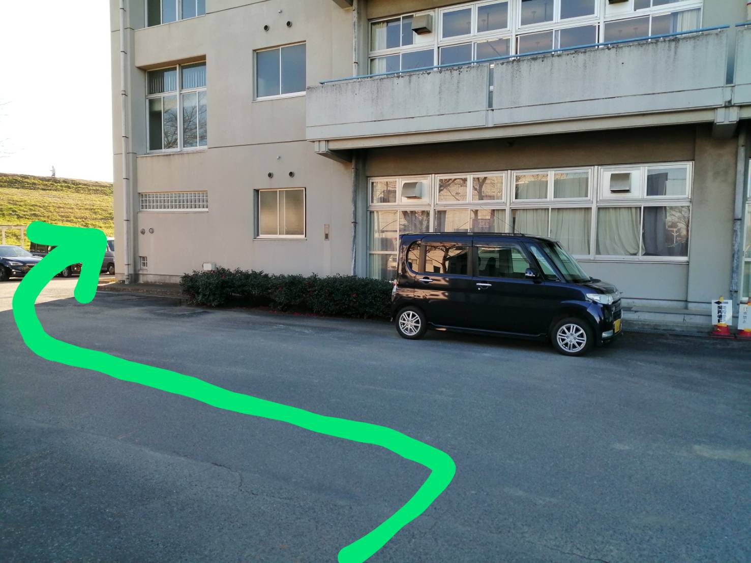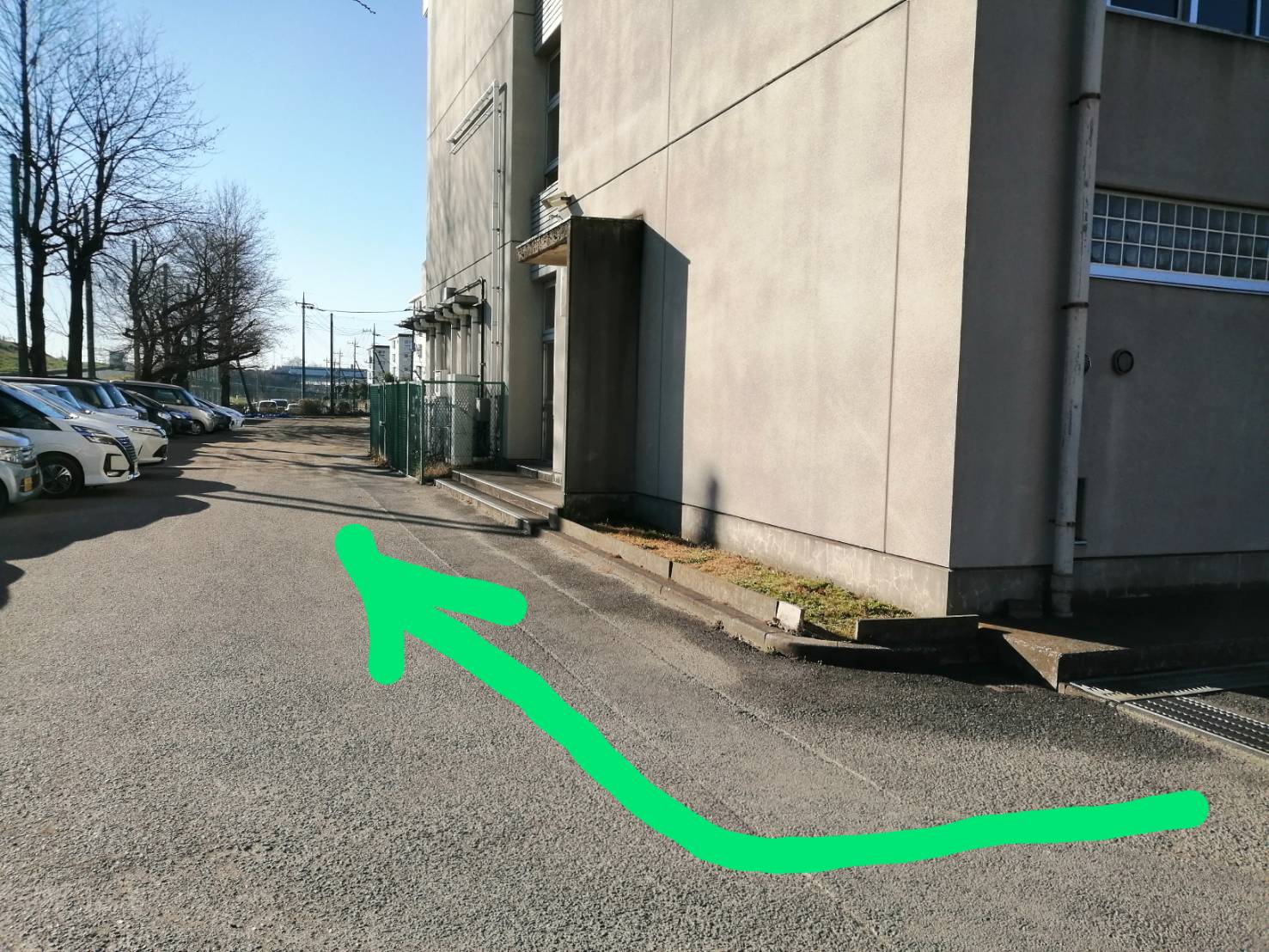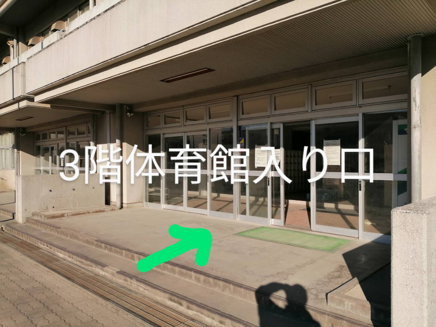 教育センターは元小学校で校舎の裏(運動場)のほうから建物に入り、右に進むと突き当りに階段があります、階段で3Fまで上がったところが体育館です。